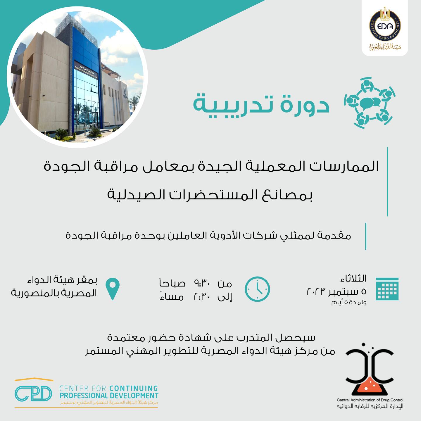 من المقرر بدء انعقاد الدورة التدريبية يوم الثلاثاء الموافق ٥ سبتمبر ٢٠٢٣ ولمدة خمسة أيام تدريبية منفصلة بمقر هيئة الدواء المصرية بالمنصورية في قاعة المحاضرات.