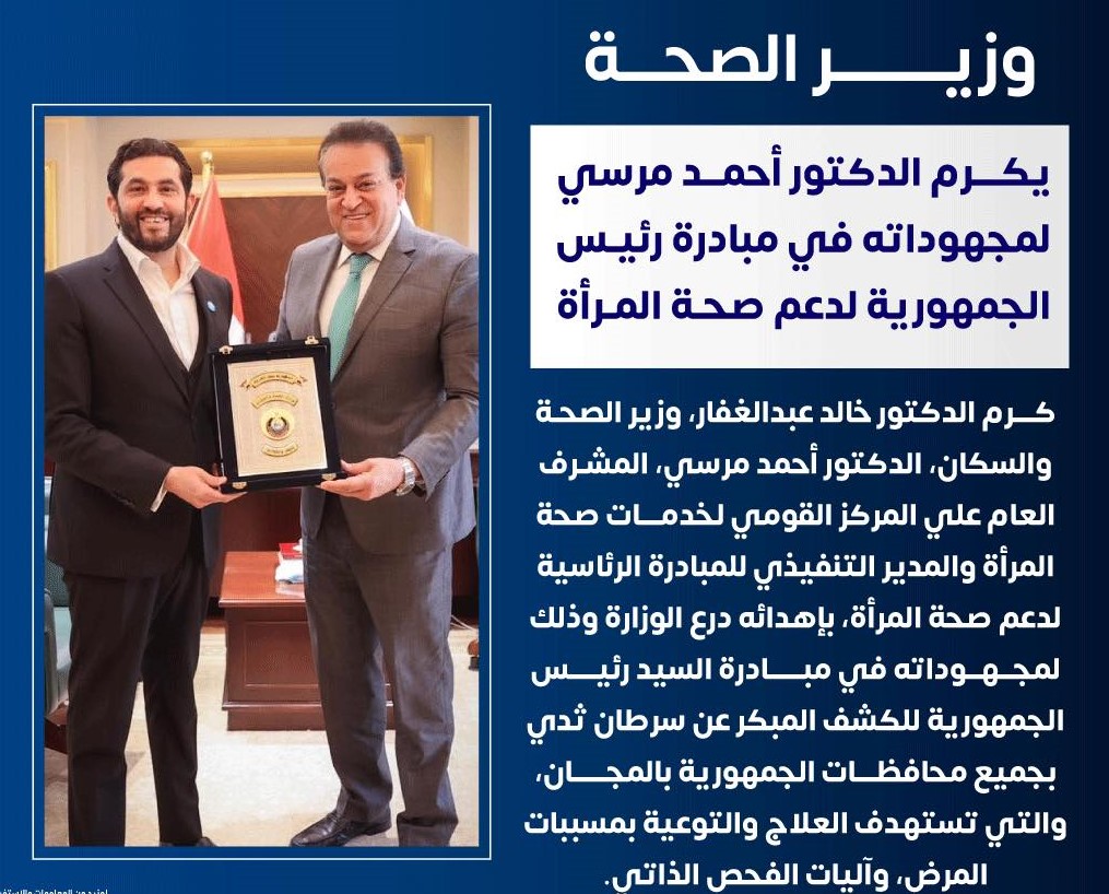 كرم الدكتور خالد عبدالغفار، وزير الصحة والسكان، الدكتور أحمد مرسي، المشرف العام علي المركز القومي لخدمات صحة المرأة والمدير التنفيذي للمبادرة الرئاسية لدعم صحة المرأة، بإهدائه درع الوزارة وذلك لمجهوداته في مبادرة السيد رئيس الجمهورية للكشف المبكر عن سرطان ثدي بجميع محافظات الجمهورية بالمجان، والتي تستهدف العلاج والتوعية بمسببات المرض، وآليات الفحص الذاتي