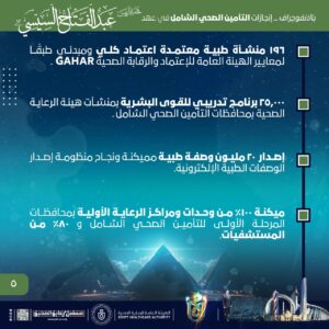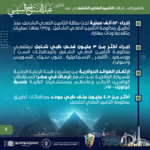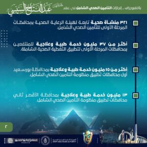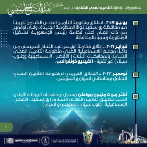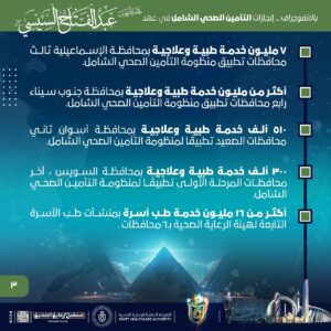 وأشار الانفوجراف إلى ارتفاع العوائد الدولارية من مشروع هيئة الرعاية الصحية للسياحة العلاجية تحت شعار العلامة التجارية (نرعاك في مصر) لاستقطاب الوافدين الأجانب وعلاجهم بمستشفيات الهيئة بنسبة تجاوزت 700%، مشيرًا إلى إنشاء أكثر من 4.8 مليون ملف طبي موحد بمحافظات تطبيق منظومة التأمين الصحي الشامل ، وإطلاق 25,000 برنامج تدريبي للقوى البشرية بمنشآت هيئة الرعاية الصحية بمحافظات التأمين الصحي الشامل.