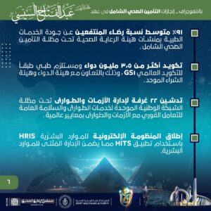 واختتم الانفوجراف بمتوسط نسبة رضاء المنتفعين عن جودة الخدمات الطبية بمنشآت هيئة الرعاية الصحية تحت مظلة التأمين الصحي الشامل التي تجاوز نسبة 91%، منوهًا إلى تدشين 22 غرفة لإدارة الأزمات والطوارئ تحت مظلة الشبكة الوطنية الموحدة لخدمات الطوارئ والسلامة العامة للتعامل الفوري مع الأزمات والطوارئ بمعايير عالمية.