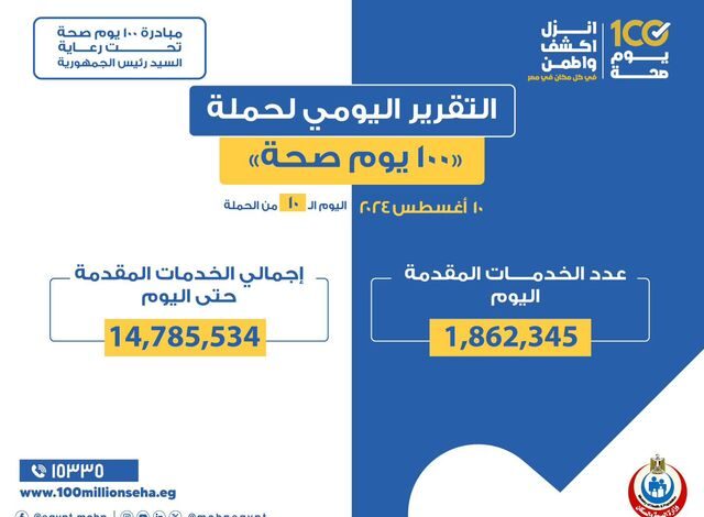 أعلن الدكتور خالد عبدالغفار نائب رئيس مجلس الوزراء ووزير الصحة والسكان، تقديم 14 مليون و785 ألفا و534 خدمة طبية من خلال حملة «100 يوم صحة» منذ إطلاق الدكتور مصطفى مدبولي رئيس مجلس الوزراء، للنسخة الثانية، مساء يوم 31 يوليو 2024، وحتى مساء أمس السبت 10 أغسطس، في جميع محافظات الجمهورية، برعاية السيد الرئيس عبدالفتاح السيسي.