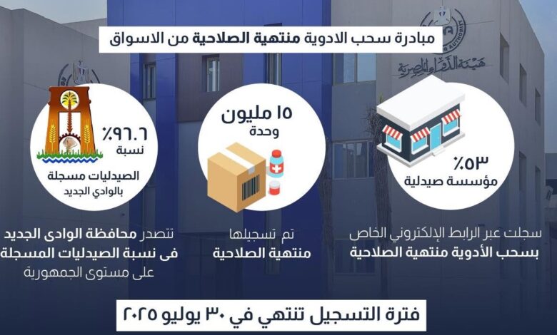 هيئة الدواء: سحب الأدوية منتهية الصلاحية من السوق.. تسجيل 53٪ من المؤسسات الصيدلية.. والتسجيل ينتهي 30 يوليو