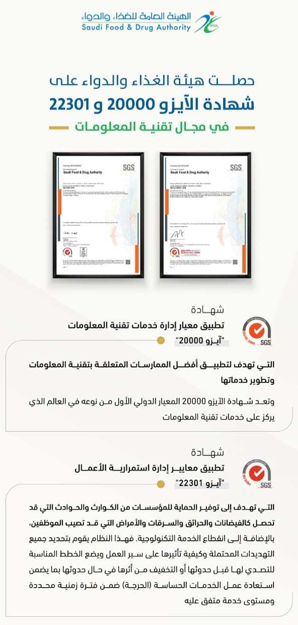 الهيئة العامة للغذاء والدواء السعودية تحصل على شهادتي “ISO” في تطبيق معايير إدارة خدمات تقنية المعلومات وإدارة المخاطر